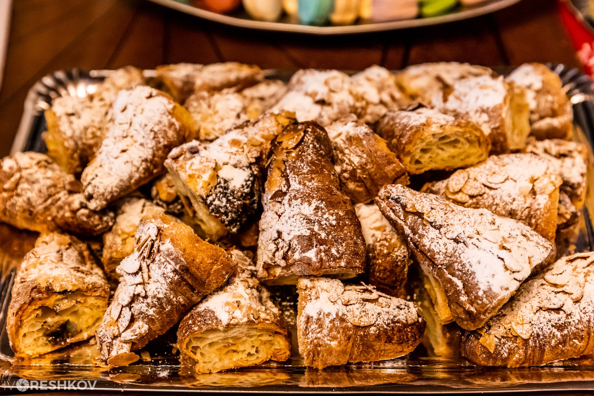 Кутия от 10 бр кроасани с бадемов крем, нарязани на две.